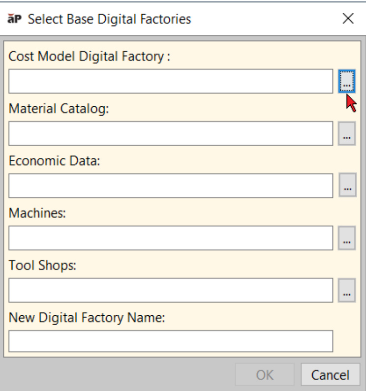 2. 在"选择基本数字工厂"窗口中,为成本模型、材料目录、经济数据、机器和工具车间选择父数字工厂。