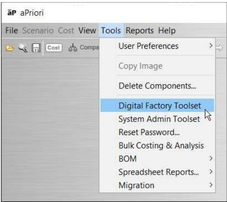 1. 如果数字工厂工具集尚未打开,请在【几何成本估算软件】 Professional 菜单栏中单击 工具 > 数字工厂工具集